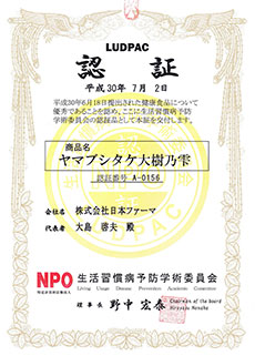 ヤマブシタケ大樹乃雫は「健康・安全・品質・機能に優れた商品」として認証を受けています。